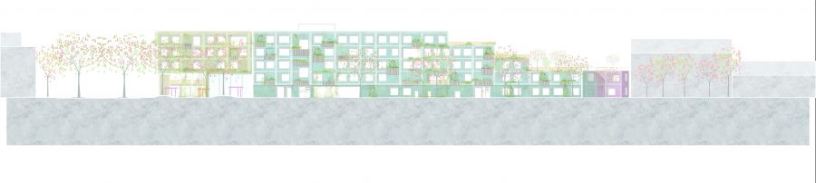 Der Baukörper orientiert sich straßenbegleitend an der Kreuzung zweier Hauptachsen (Ecke Schloßhofer Straße / Freytaggasse). Dadurch entsteht ein geschützter, großzügiger Freiraum, abgeschirmt von Verkehr, Lärm und Einblicken.