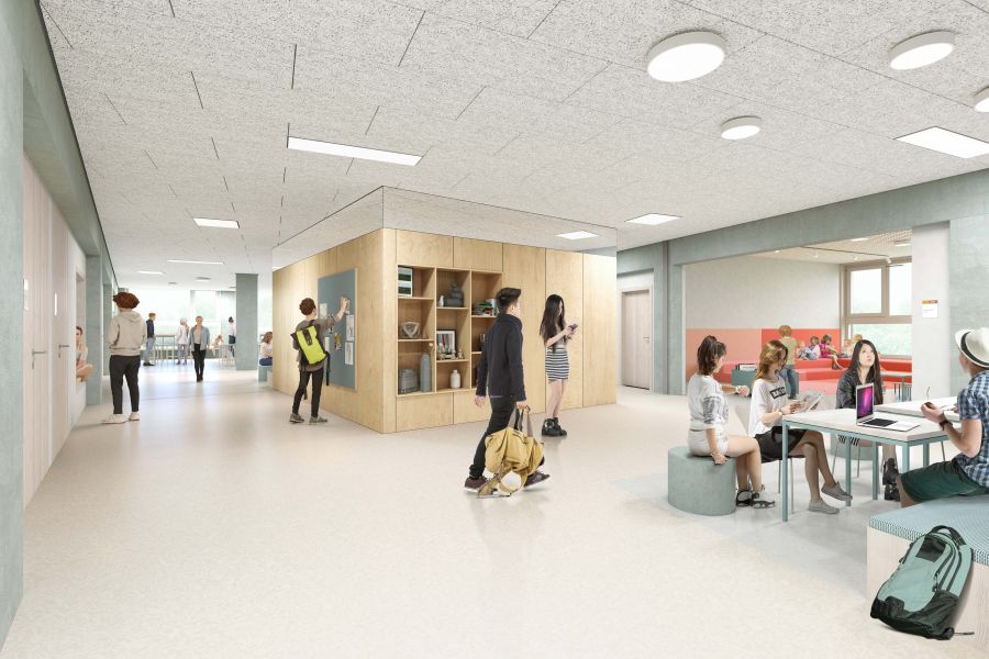 Am Kreuzungspunkt formt das Gebäude seinen höchsten Punkt aus und definiert so eine prägnante Adresse mit Vorplatz. Dieser wirkt als öffentlicher Begegnungsraum und führt direkt zur Aula sowie zu extern erschlossenen Funktionen wie Turnsälen, Bibliothek und dem Veranstaltungssaal. Der Zugang zum Praxiskindergarten befindet sich im Bereich der niedrigsten Gebäudehöhe. Der bewusst gewählte menschliche Maßstab unterstützt die Identifikation der Kinder mit ihrem Lern- und Spielort.