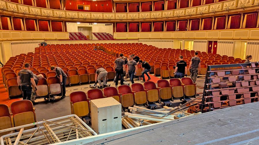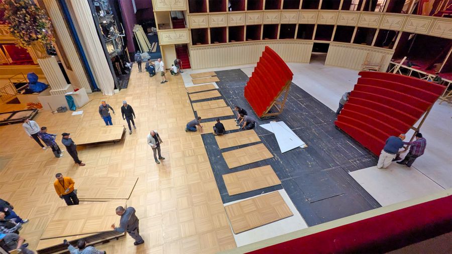 Der Zuschauerraum mit rund 470 Stühlen und der Bühnenraum verwandeln sich zu einem imposanten Ballsaal. Die Stühle werden abgebaut und stattdessen eine Unterkonstruktion für das Tanzparkett auf Höhe der Bühne errichtet. Auf diese Unterkonstruktion wird der Boden wie bei einem Puzzle Stück für Stück aufgelegt, sodass schlussendlich ein mit der Bühne bündiger Parkettboden entsteht. Jedes Jahr wird das Tanzparkett auf diese Weise auf- und abgebaut.