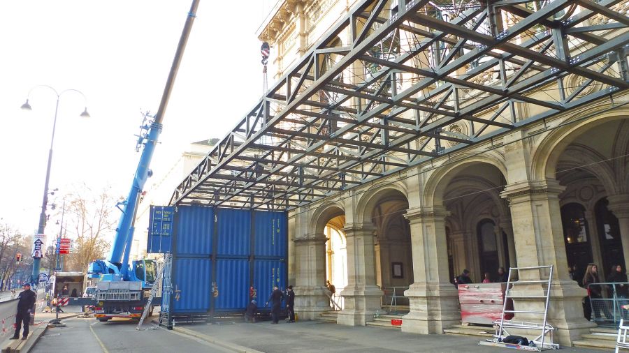 Vor dem Eingangsbereich der Staatsoper wird für den Opernball eine spezielle Redcarpet-Zone errichtet. Die Aufstellung Stahlkonstruktion die mit teppichbespannten Paneelen verkleidet wird erfolgt in den wenigen Tagen vor dem Ball und wird von uns hinsichtlich der Tragwerkskonstruktion kontrolliert.